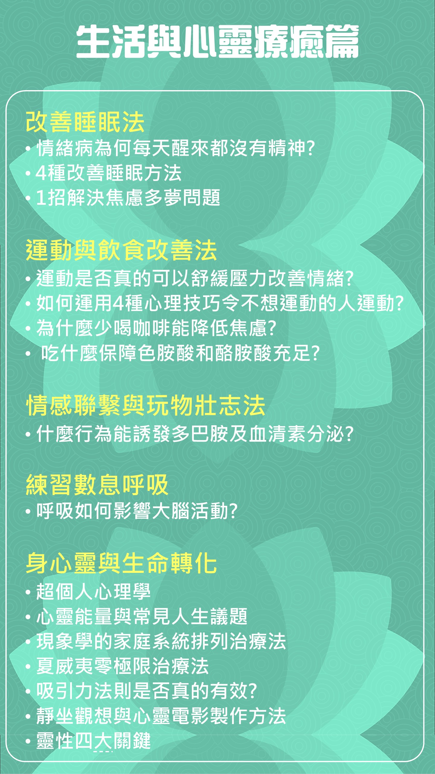 本課程為知識與心得分享,內容包括但不限於心理學,醫學研究,網上資訊,數據及個人心得, 課程不構成任何醫學建議。如有健康問題,請向你的醫生諮詢